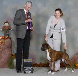 CH. Faberly's Fin Du Monde (pictured at 1 year) finished Canadian Championship with BOS over a Special 4 Best Puppy in Breed Breeder/Owner handler (6-pts), Josie O'Reilly, Summer Boxers (1-pt), other handler (3-pts) (ex Can Ch. Faberly's Praying Anstice, HIC) D.O.B January 21, 2017 DM Carrier